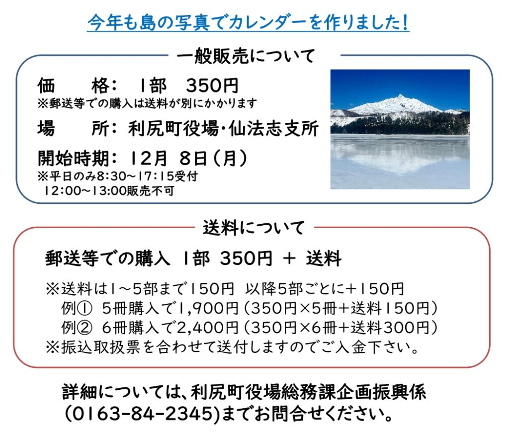 今年も「地域みんなで利尻自慢!」をテーマに、島内及び利尻島に縁のある方に「利尻のここが好き!」「ここが自慢!」そういった、とっておきの風景で2026年版の「島自慢カレンダー」を作りましょう!というコンセプトのもと写真を募集したところ、多数の応募があり、その中から自慢の風景でカレンダーを作ることが出来ました。